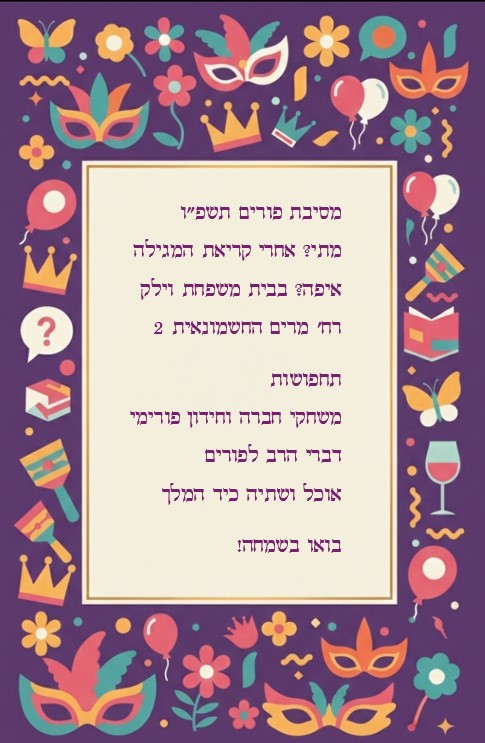 - ראו הזמנת הקהילה למסיבת פורים בבית הרב ושושי וילק כאן.